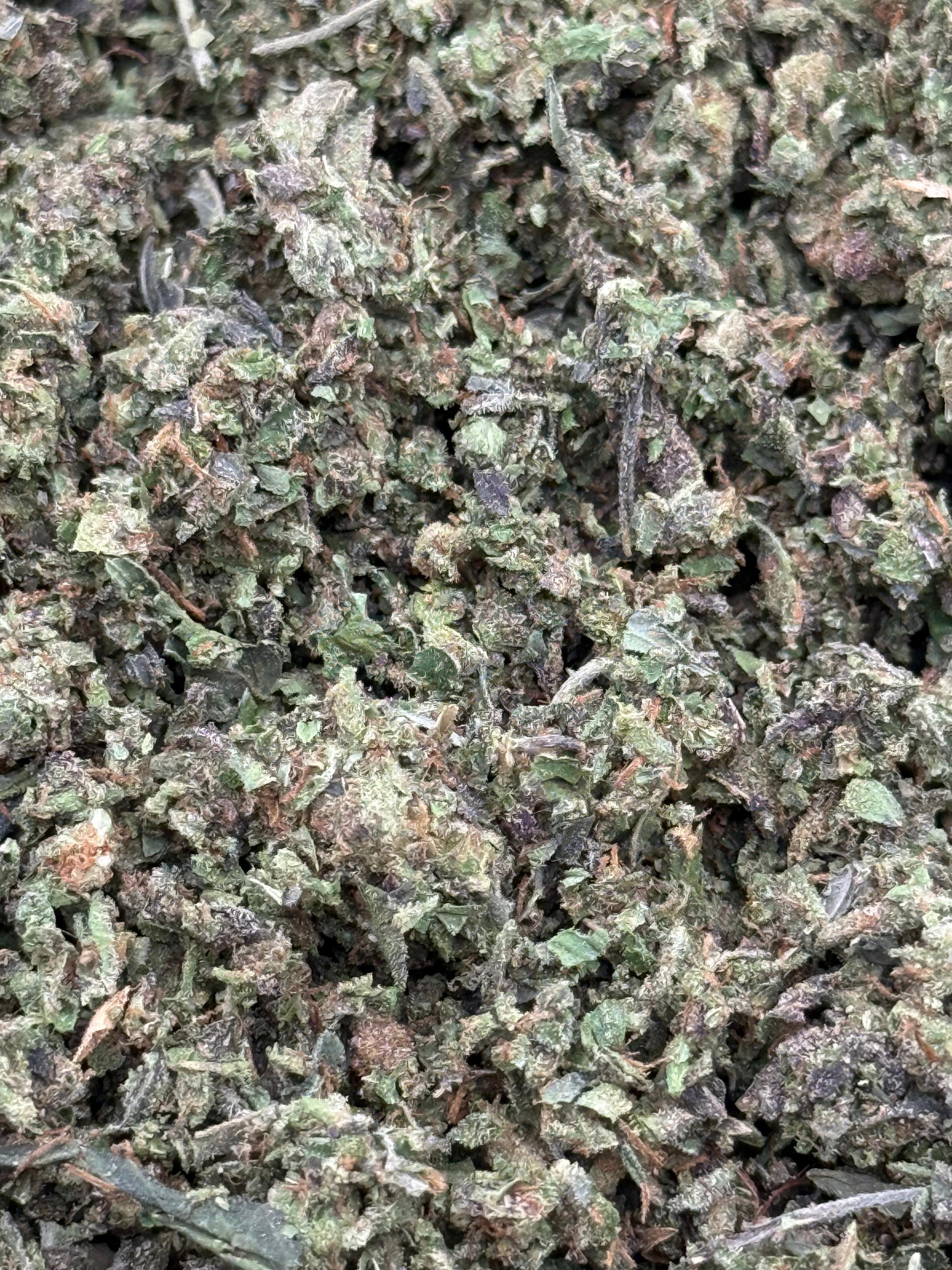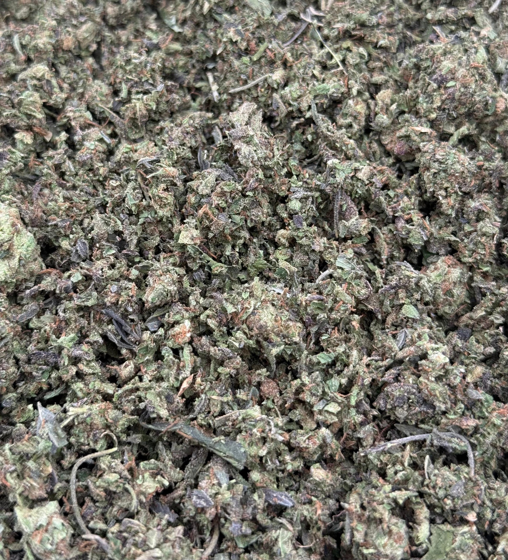 Appearance: This shake presents a mix of light green and amber pieces, accented with fine trichomes and orange pistils. Its frosty texture reflects the strain’s rich terpene profile.
