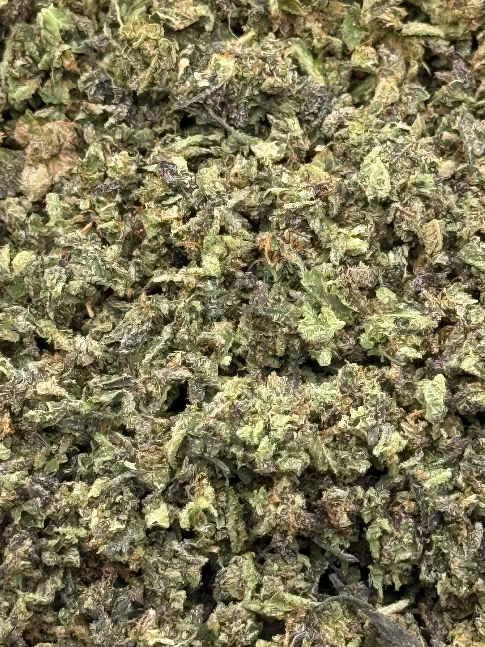Appearance: The buds are thick and compact, displaying deep green hues with streaks of violet and indigo. Bright orange pistils curl through the dense structure, while a heavy layer of trichomes gives the surface a sugary, resin-coated finish.