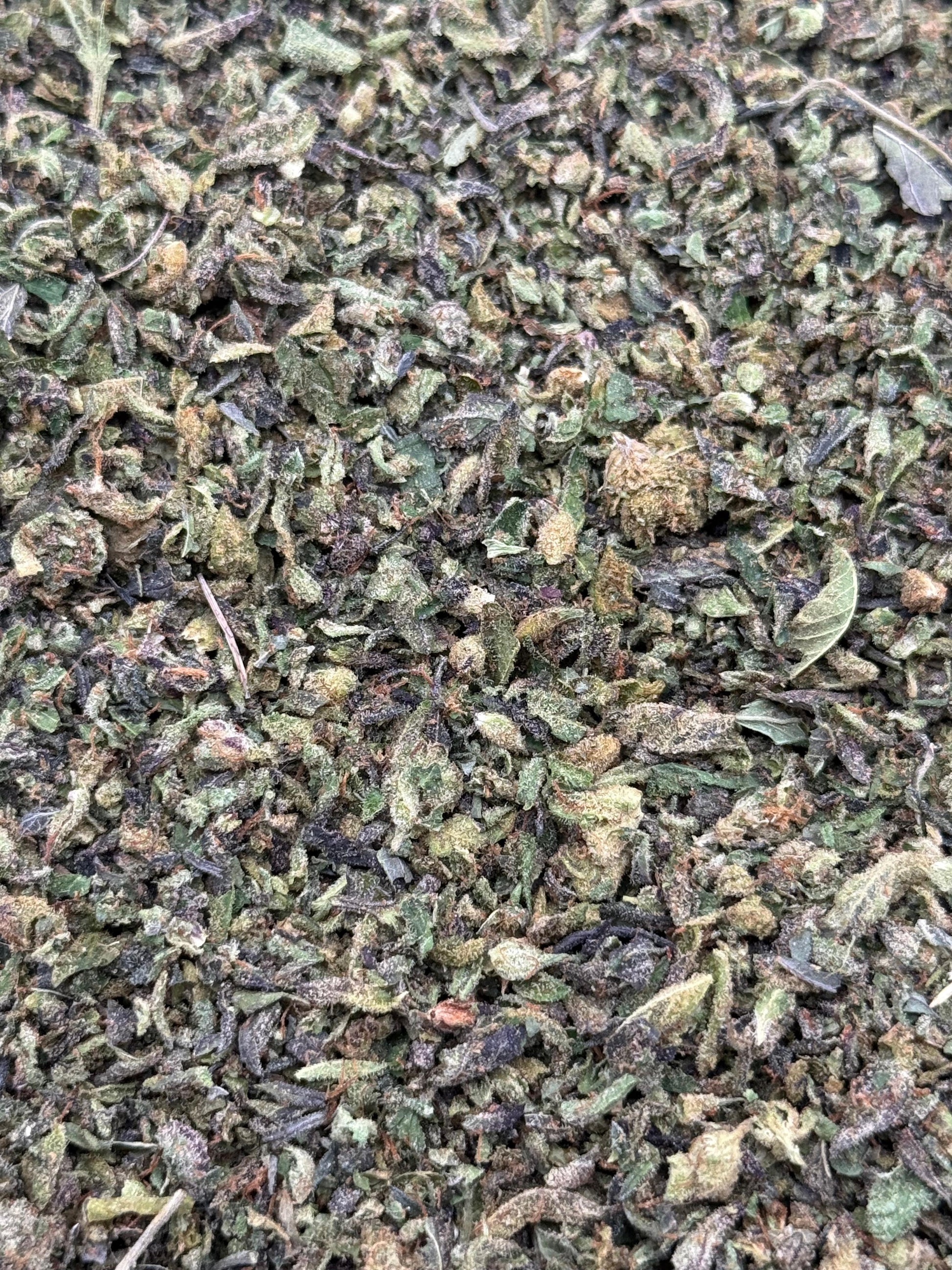 Appearance: The buds are dense and compact, featuring dark green tones with deep purple accents woven throughout. Thick amber pistils curl across the surface, and a heavy coating of trichomes gives the flower a frosted, resin-coated finish.