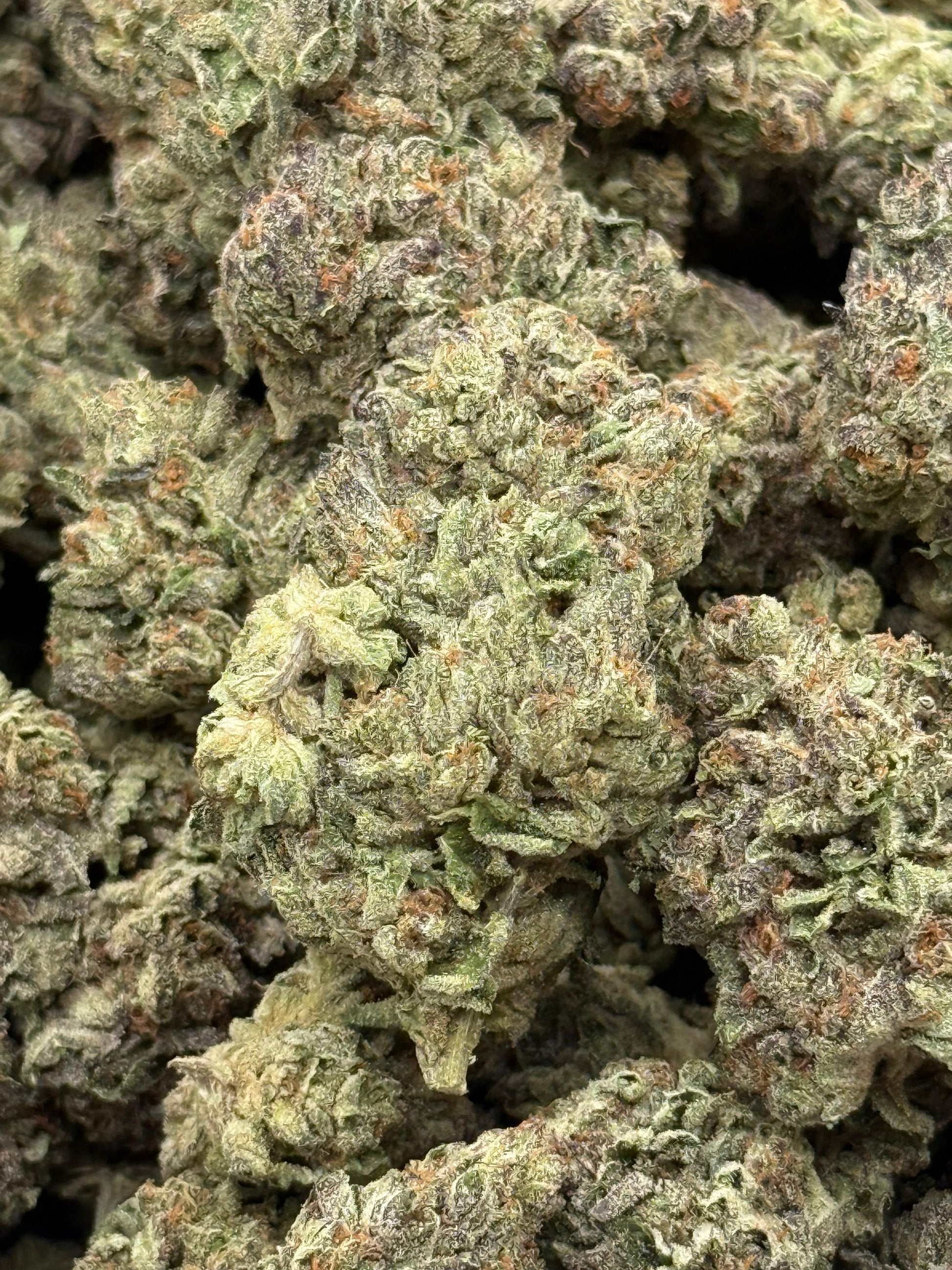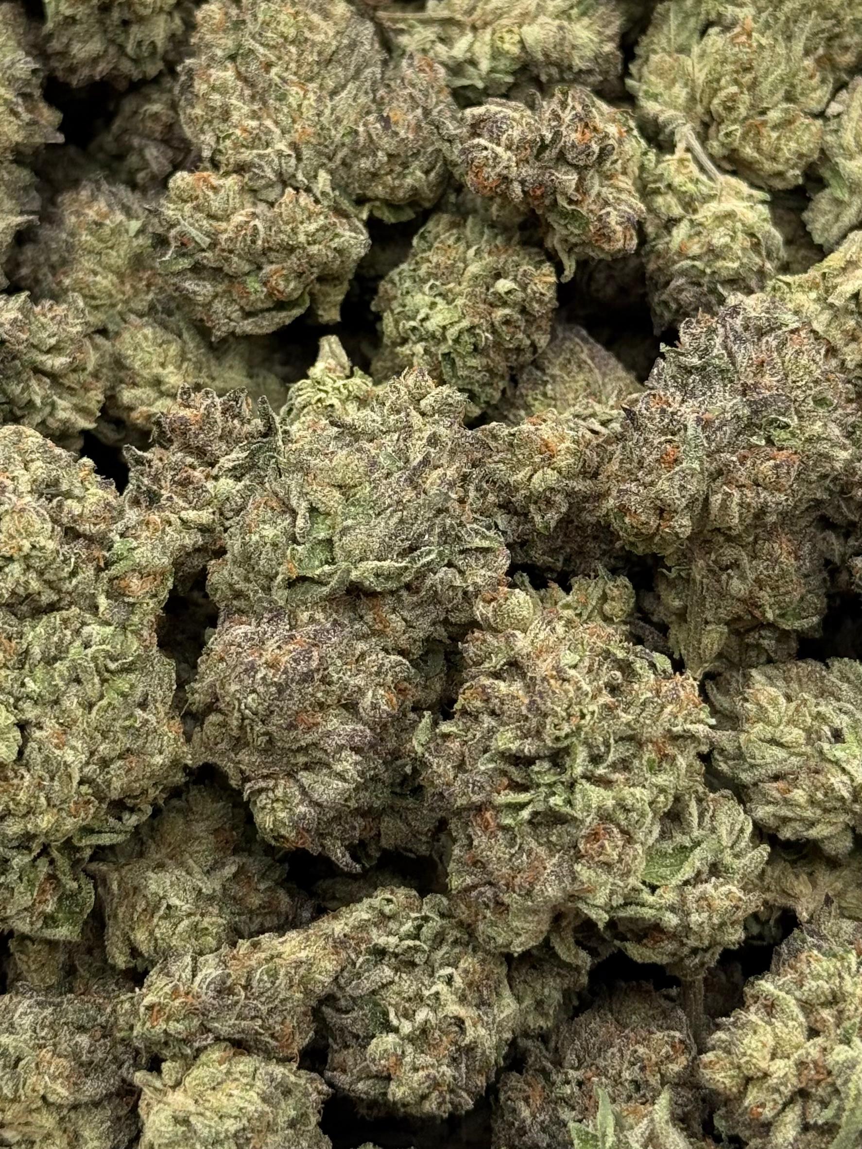 Appearance: This strain features compact, weighty buds coated with a thick blanket of frosty trichomes. Dark forest-green tones dominate the flower, accented by deep purple shades and thick, burnt-orange pistils. The overall look matches its name—solid, sturdy, and rich.