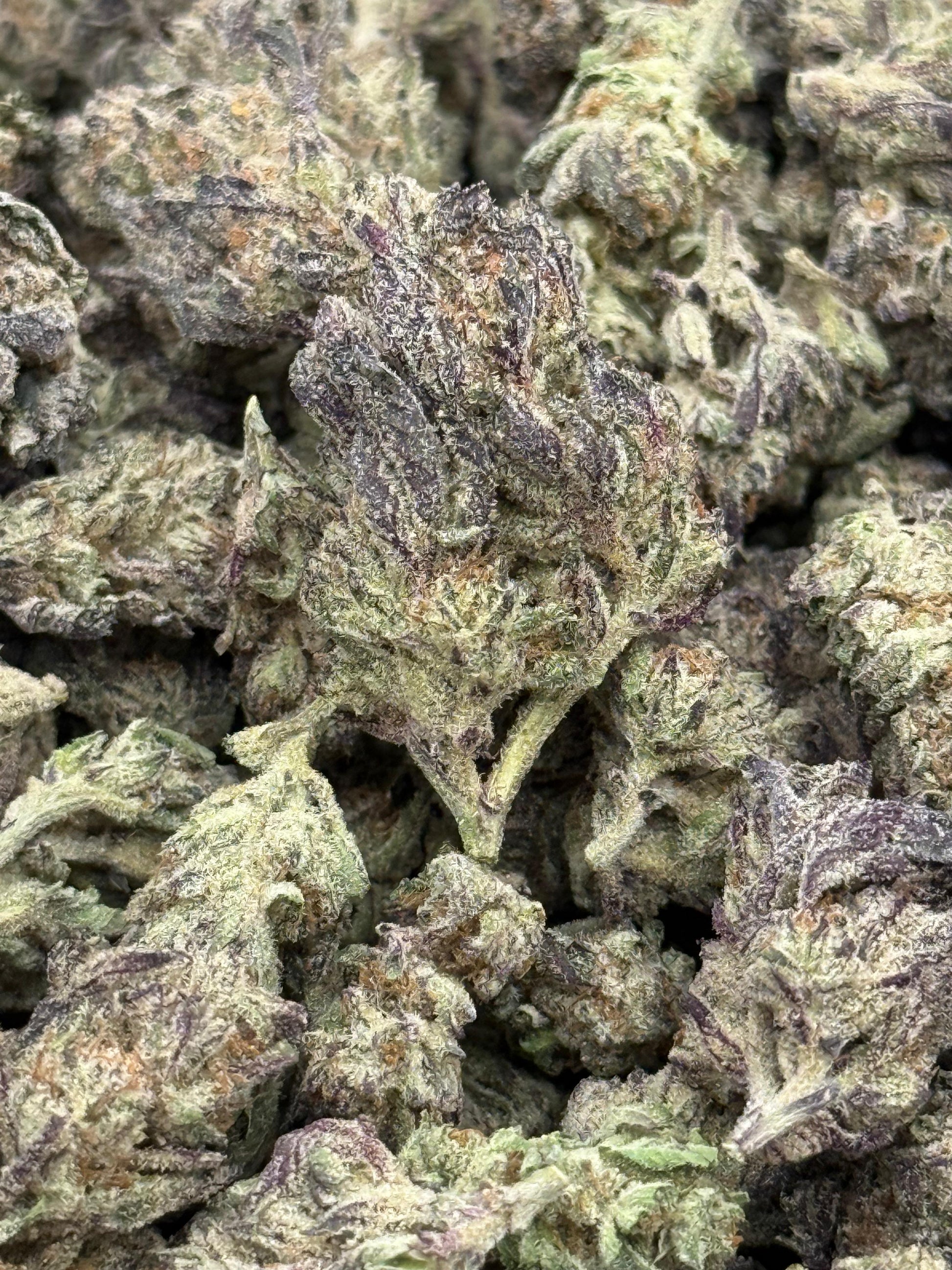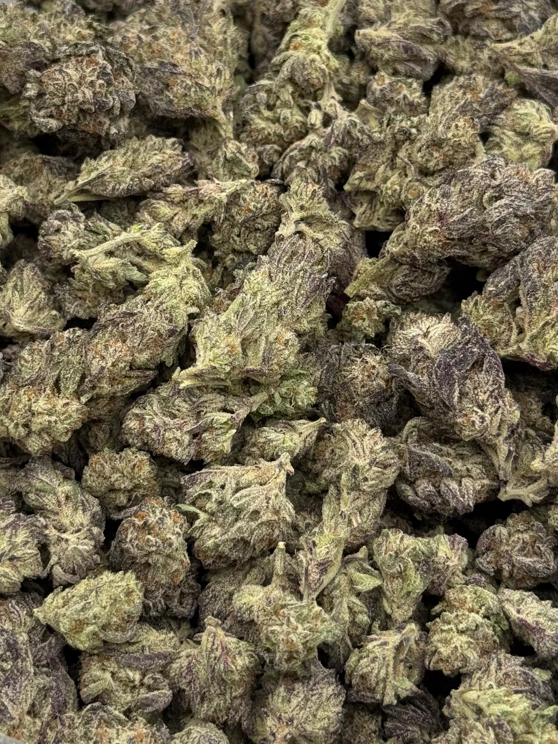 Appearance: The buds are medium to large with a well-formed, slightly rounded structure. Bright green tones are accented by streaks of purple and copper pistils, all coated in a generous layer of sparkling trichomes that give the surface a resin-rich finish.