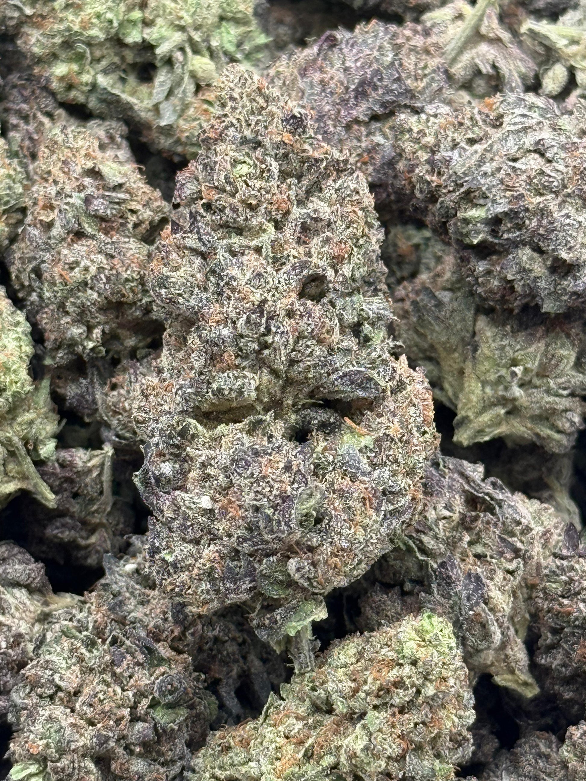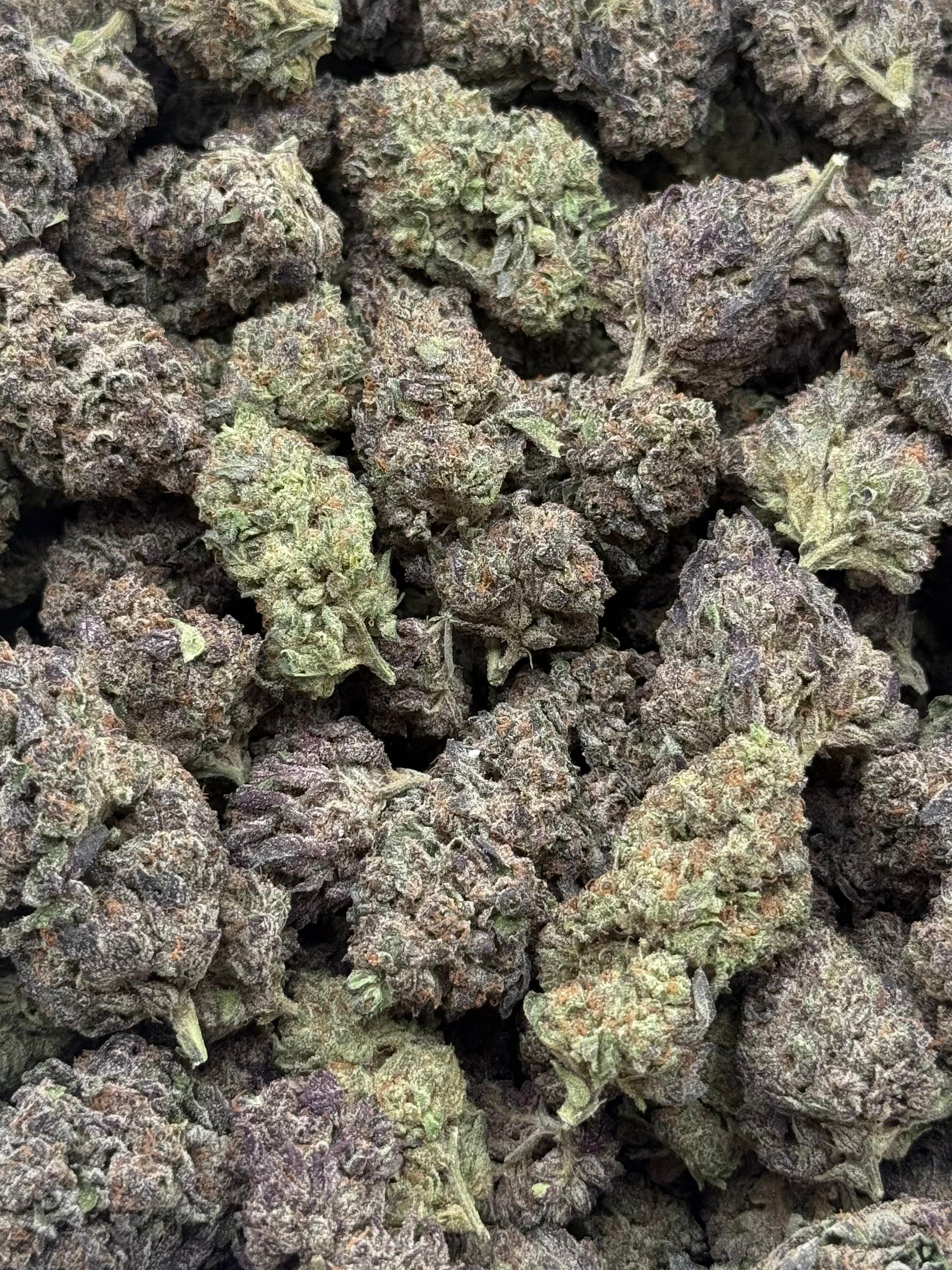 Appearance: This flower forms dense, rugged buds with deep green coloration and scattered amber pistils. A thick coating of trichomes gives it a gritty, frosted finish that hints at its strength.